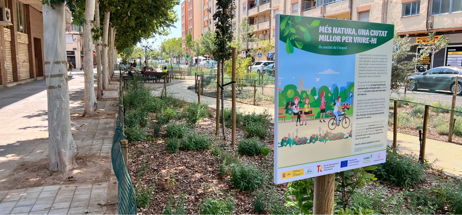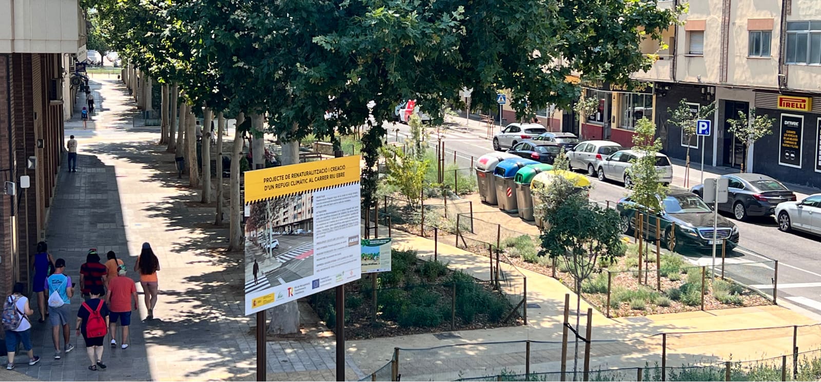 Les obres de renaturaliztació de Riu Ebre han consistit en la demolició dels paviments existents, permetent la millorar de la permeabilitat i la qualitat del sòl, reduint així l’efecte d’illa de calor a la zona urbana i propiciant l’augment de la vegetació. A més, s’han habilitat zones d’estada per al veïnat, amb paviment de sauló, bancs i cadires. D’altra banda, s’ha incorporat senyalització informativa sobre les actuacions dutes a terme i els beneficis de la biodiversitat en la salut de les persones i el medi ambient. Pel que fa a la jardineria, s’han plantat un total de 48 arbres de 14 espècies diferents, entre els de port gran, mitjà, petit i de tipus arbustiu. També s’ha dut a terme la plantació de 3.028 plantes herbàcies, enfiladisses i subarbustives de 29 espècies diferents. Una de les incorporacions més destacades són els sistemes urbans de drenatge sostenible, que ajuden a la infiltració de l’aigua de pluja al subsol i eviten possibles inundacions quan es produeixen pluges intenses. Pel que fa a la mobilitat, a més de les dues voreres i el carril bici ja existent a l’altra banda del nou passeig, el carrer manté els dos sentits de circulació per a vehicles i una de les dues fileres d’aparcaments.